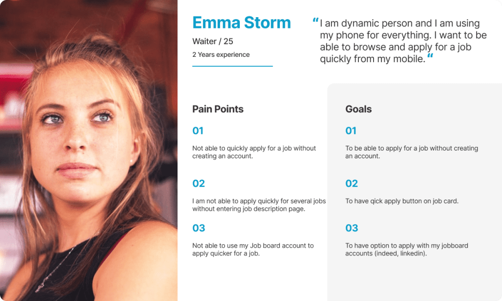 Emma is a student and waitress who needs to quickly apply for several jobs by phone because she is a dynamic person and does everything on the go.