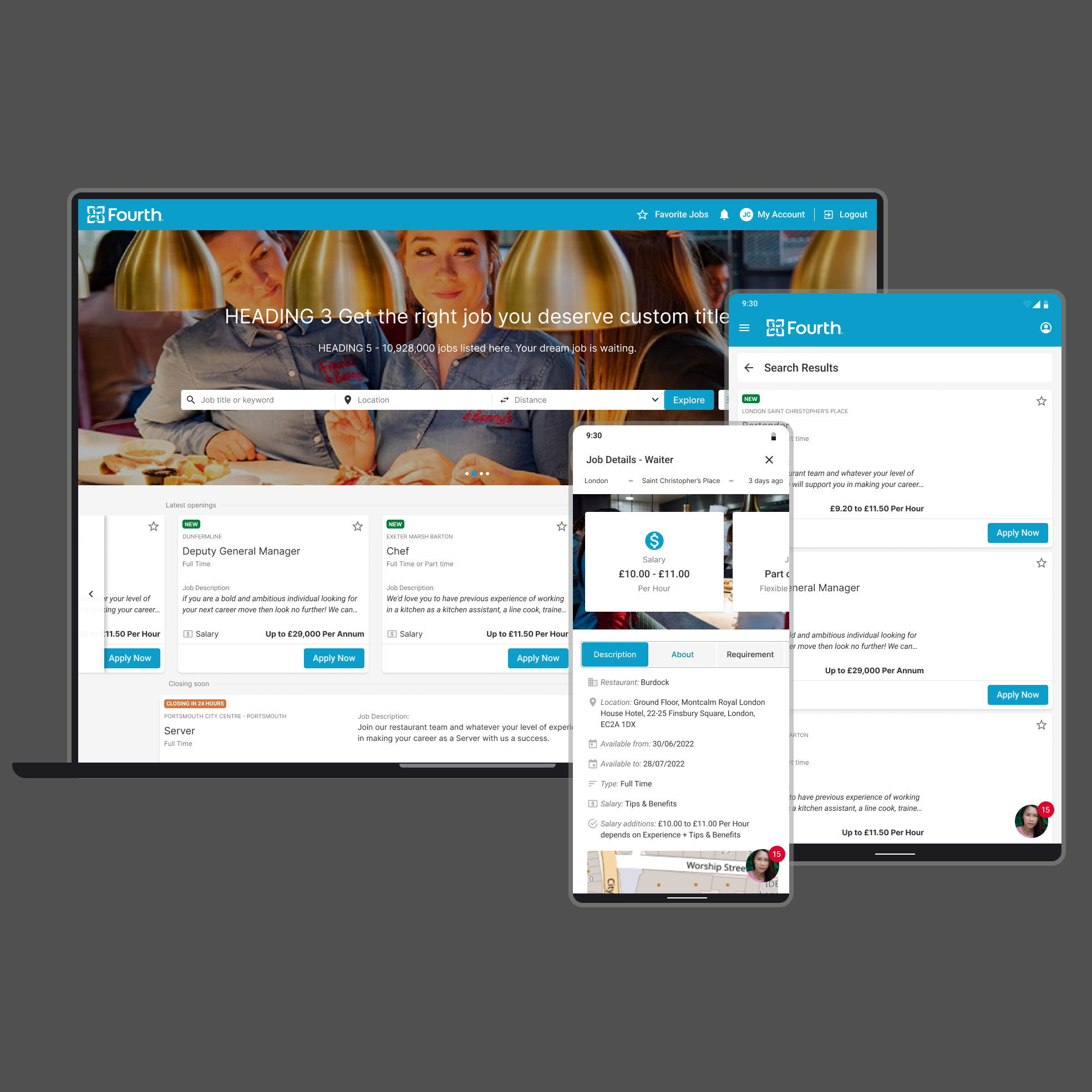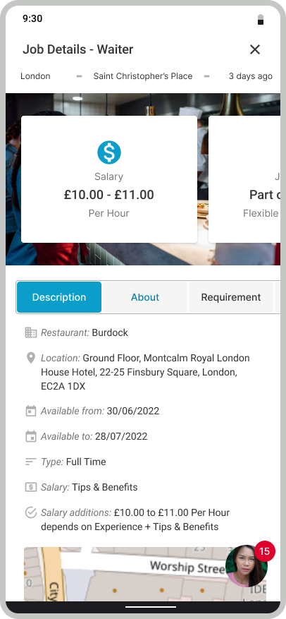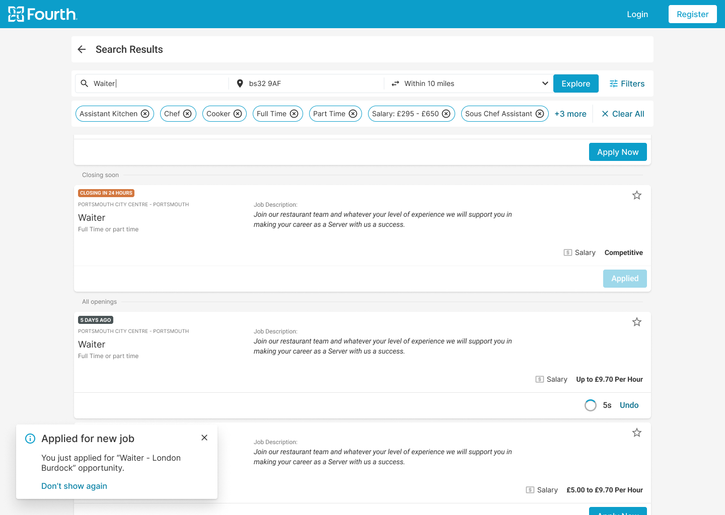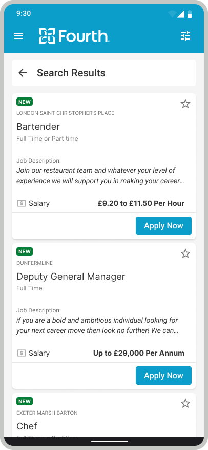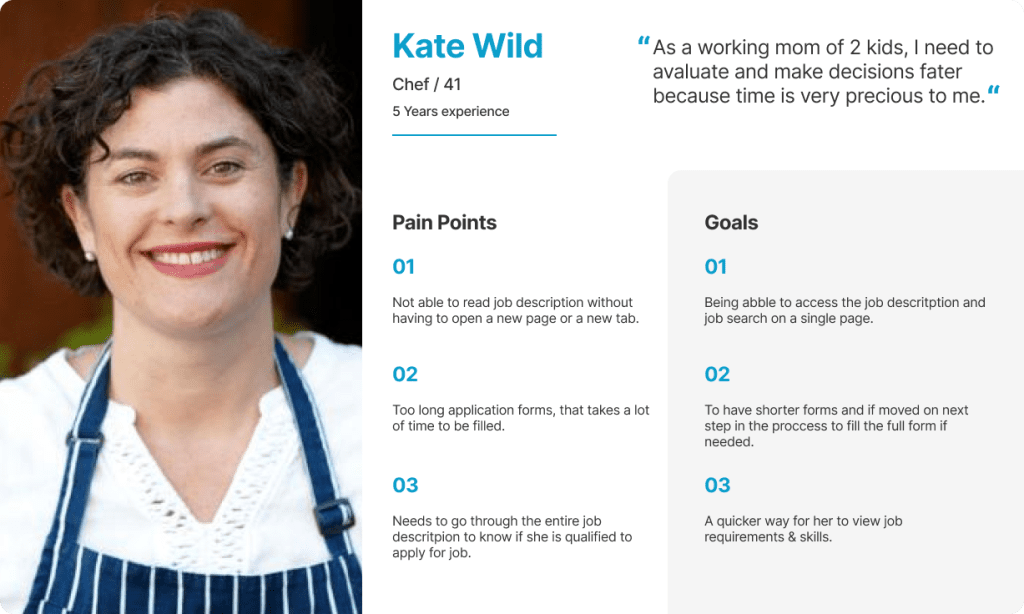 Kate is an experienced Chef and busy mom of two who needs to quickly find a new job at the nearest restaurant in the candidate portal because she is limited of time.