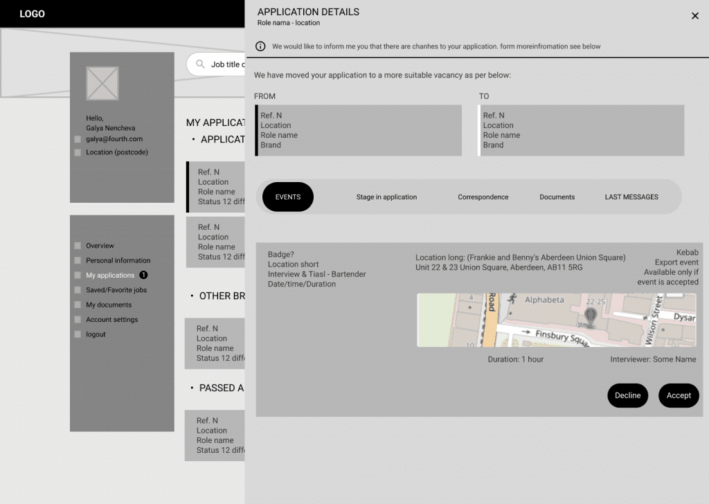 These user groups confirmed our initial assumptions that the main goal was to simplify the application process, shorten the forms, and allow users to apply without an account. We also saw the opportunity to include social logins and third-party talent providers. Users are usually applying on the go and need a quick overview of the job opening and the offer that best suits them.