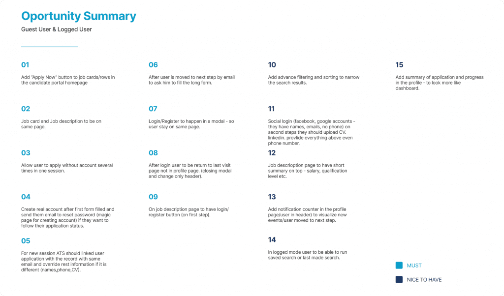Based on the personas journey maps, I create a list of improvements. I divide them into two categories – “must have” and “nice to have”. This helps us prioritize which opportunities we should implement first and is critical for user flow.