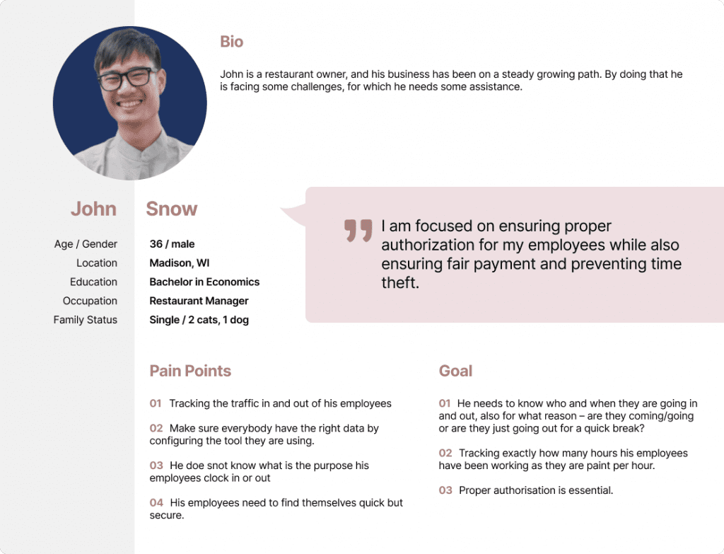 After reviewing the brief, I created a set of requirements that the design needed to follow, taking into account the manager’s need for a cheap and secure solution. Additionally, I conducted quick secondary research to identify potential user pain points and ensured that the design addressed them. The main persona, a small restaurant manager, remained the focus throughout the design process.