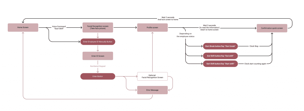 During the design process for the Clockin app, I created wireframes to visualize the user flow and interface design. To address the risks associated with COVID-19, I incorporated voice control and touchless solutions into the app’s design, with an option for manual code entry as backup. For added security and ease of use, I also integrated facial recognition technology. I do my best and ensured that the app met the project requirements and provided a seamless, secure, and efficient experience for users.