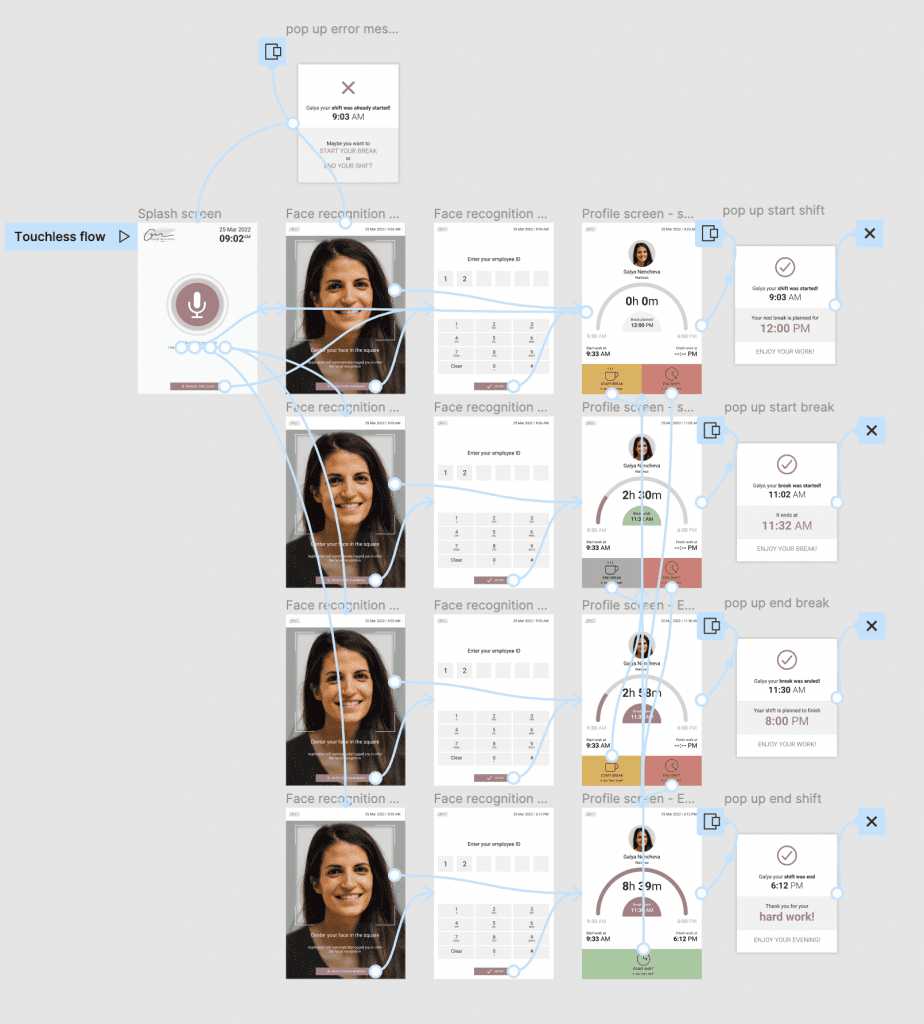 After finalizing the UI design, I proceeded to turn the mockups into a prototype that would represent the real user experience. However, due to software limitations, the voice command feature had to be changed to a click-based system, which still provided a touchless solution. The prototype allowed me to test and refine the user flow, ensuring that the clock in, clock out, and break actions were intuitive and easy to use, and that the color-coded performance indicators were effective in conveying information to the user.