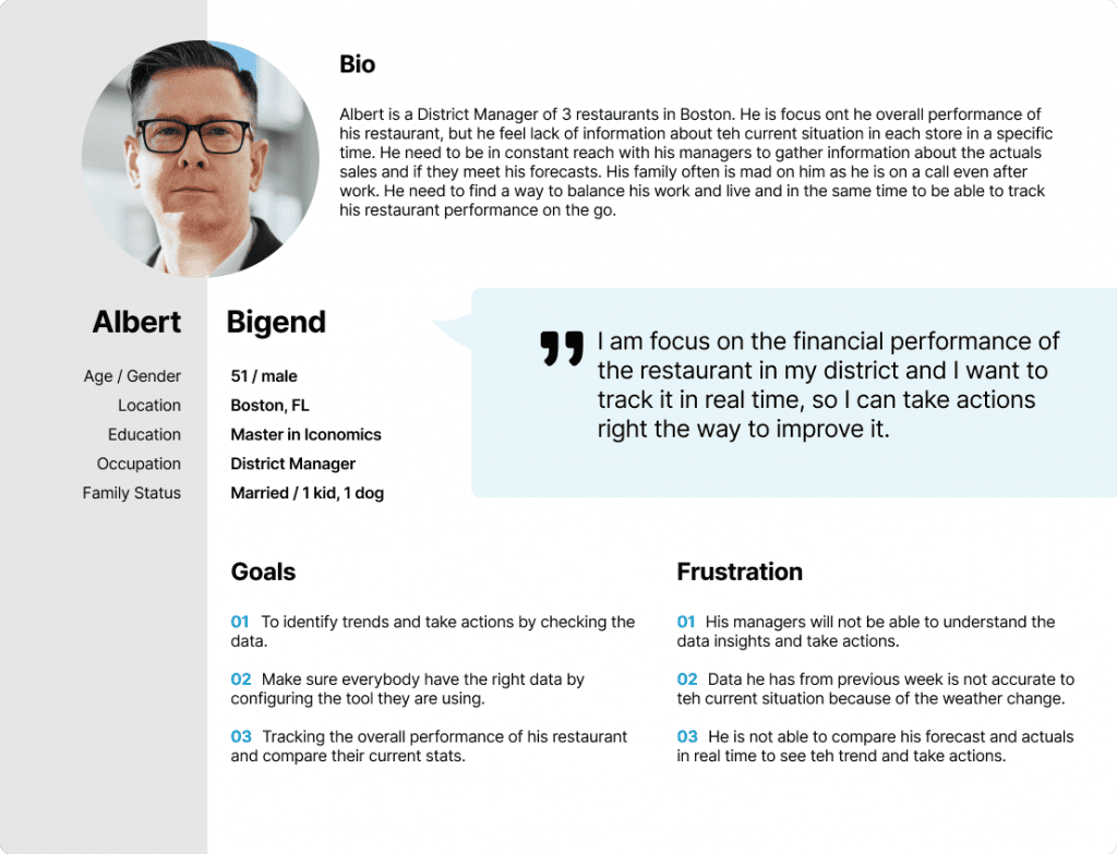According to the interviews and a survey, this user group confirmed the initial assumptions about the lack of real-time data, but the research also showed that this is not the only requirement. Managers also need data presented and organized in different ways depending on location and department. They also want to drill down into insights so they have a deeper understanding of the data. All of this needs to be company branded and permission driven to fully meet their needs.
