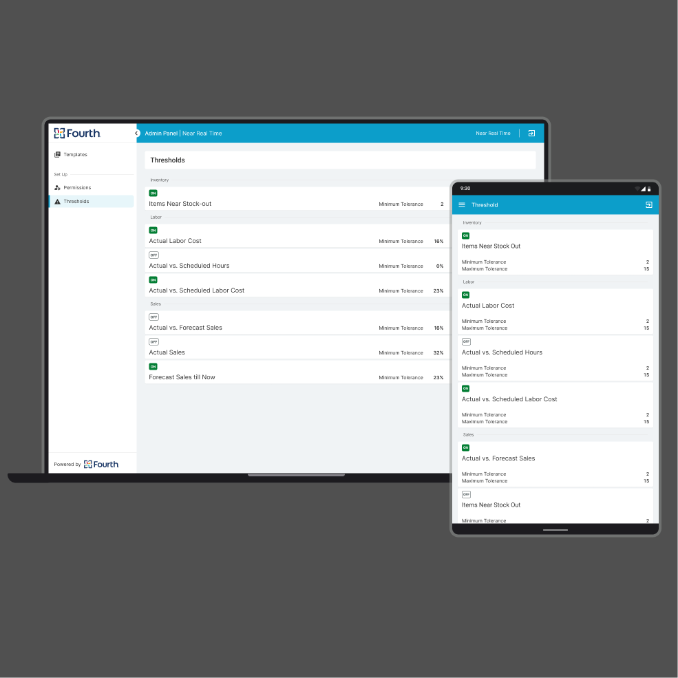 Add alerts and notification in the managers view of the dashboard for numbers outside the tolerance set up in the admin.